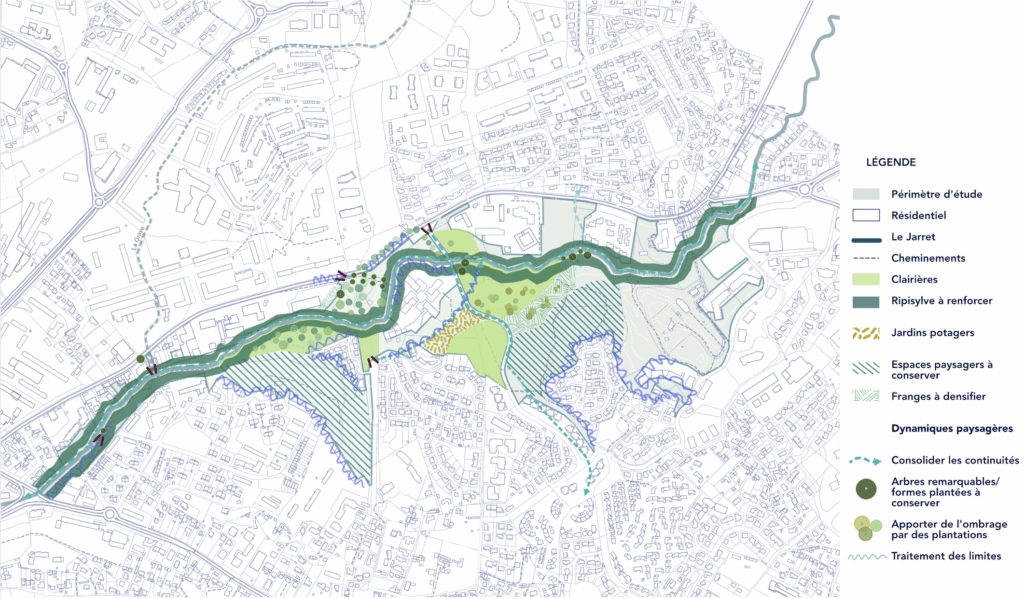 Nous travaillons sur ce projet avec une attention particulière portée aux enjeux de continuités écologiques, de renaturation, et d’appropriation citoyenne. Le but étant de redonner un souffle et une place à ce cours d’eau trop longtemps. Celui ci à longtemps été contraint par l’artificialisation et les multiples usages de la vallée du Jarret.