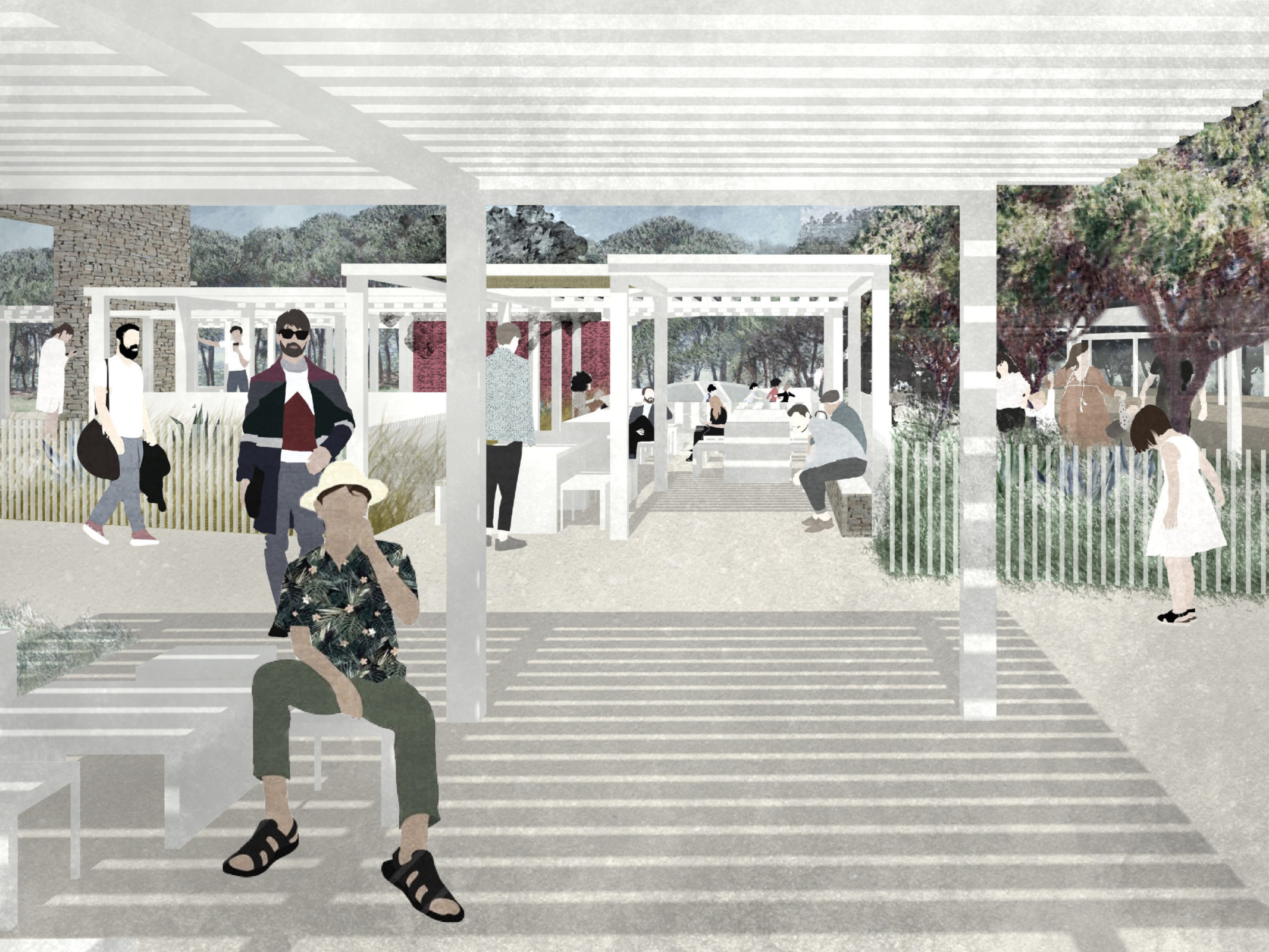 La transition est le maître mot de ce paysage et celui qui guide l’ensemble du projet. C’est ainsi la transition entre intérieur et extérieur qui est ici l’objet de toutes les attentions. De la baraque de pêcheur aux restaurants et bars de bords de plage, dont les terrasses semi couvertes s’étirent comme une continuité de l’espace intérieur, là réside l’inspiration qui porte le projet. C’est donc dans cette ambiance décontractée que les voyageurs pourront profiter d’un peu de repos avant de se mesurer à la force des vents et de la mer. Le projet s’organise autour d’une structure modulaire et modulable, organisée sur une trame, permettant de nombreuses variations et une multiplicité des ambiances.