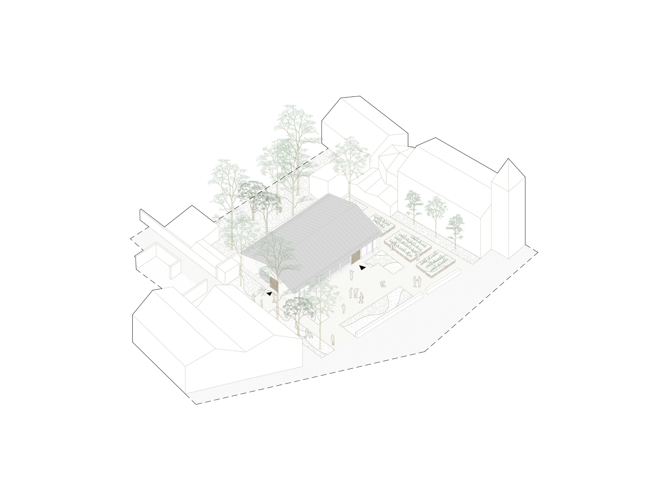 Nous cherchons à révéler l’identité du centre-bourg en proposant une ouverture de la parcelle sur la place de l’église et la venelle sud. Ce geste fait suite à l’étude du développement urbain du centre-bourg, et permettra ainsi de désenclaver ces espaces aux forts potentiels. En créant un jardin de curé, le projet renoue avec l’histoire du lieu en soulignant la présence de l’église qui encadre la parcelle. Les aménagements paysagers proposés permettent aux habitant d’accéder à des espaces de déambulation parmi des massifs de plantes médicinales, odorantes et ornementales tout en créant un lieu de sociabilisation à proximité du nouveau bâtiment à destination des associations. Nous désimpermeabilisons les sols (280 m² de végétation repris sur bitume), plantons 5 arbres et un sol favorisant l’évapotranspiration.