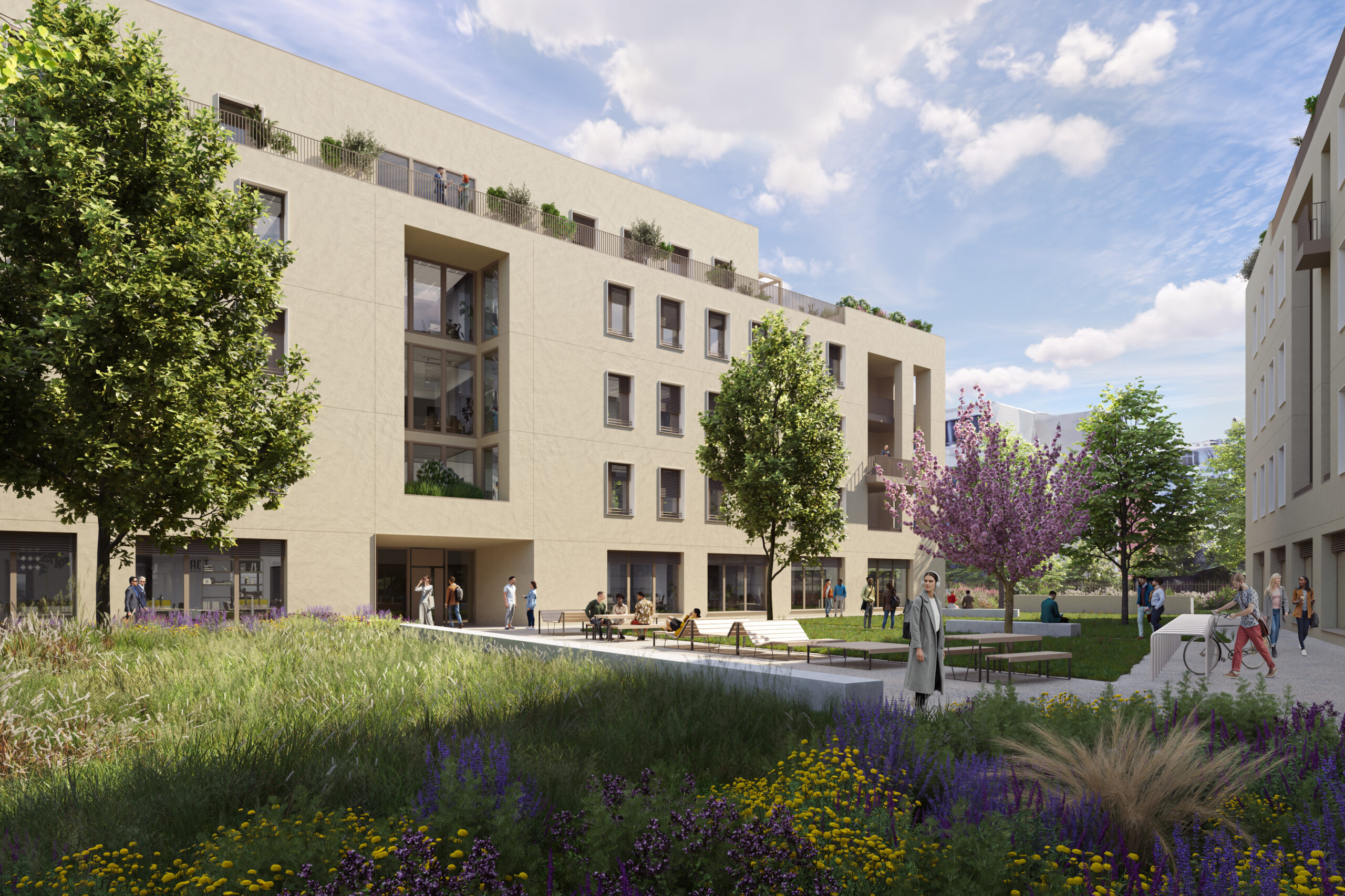L’ensemble du projet est pensé en fonction de l’existant. L’élément fondateur du projet est la création d’un espace sanctuarisé autour des arbres existants conservés, qui ne sera pas touché. Les bâtiments se placent autour de celui-ci et sont orientés de manière à répondre à la trame urbaine. Ils définissent des espaces travaillés pour offrir différents usages. Au centre, l’espace sanctuarisé, plus naturel, répond à un glacis formant l’espace d’accueil où le mobilier permet des temps d’échanges informels. Une promenade parcours le parc, traversant différentes ambiances et ponctuée d’agrès sportifs. Elle amène à un espace plus isolé où peuvent se tenir des réunions ou des temps de repos plus au calme.