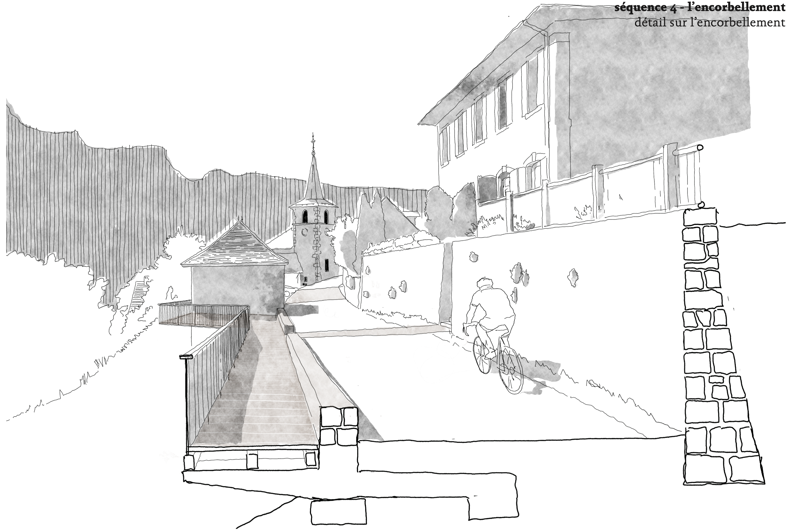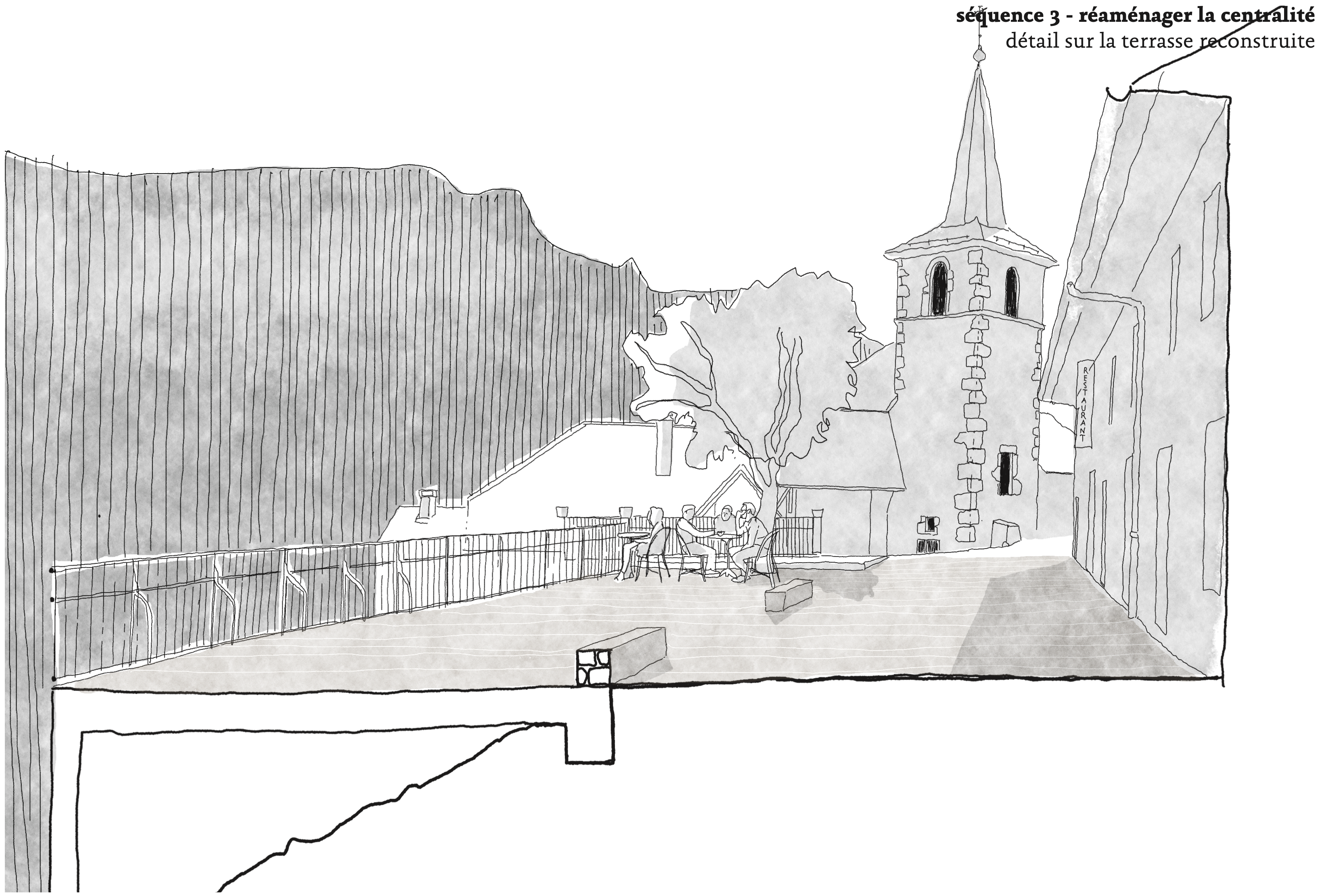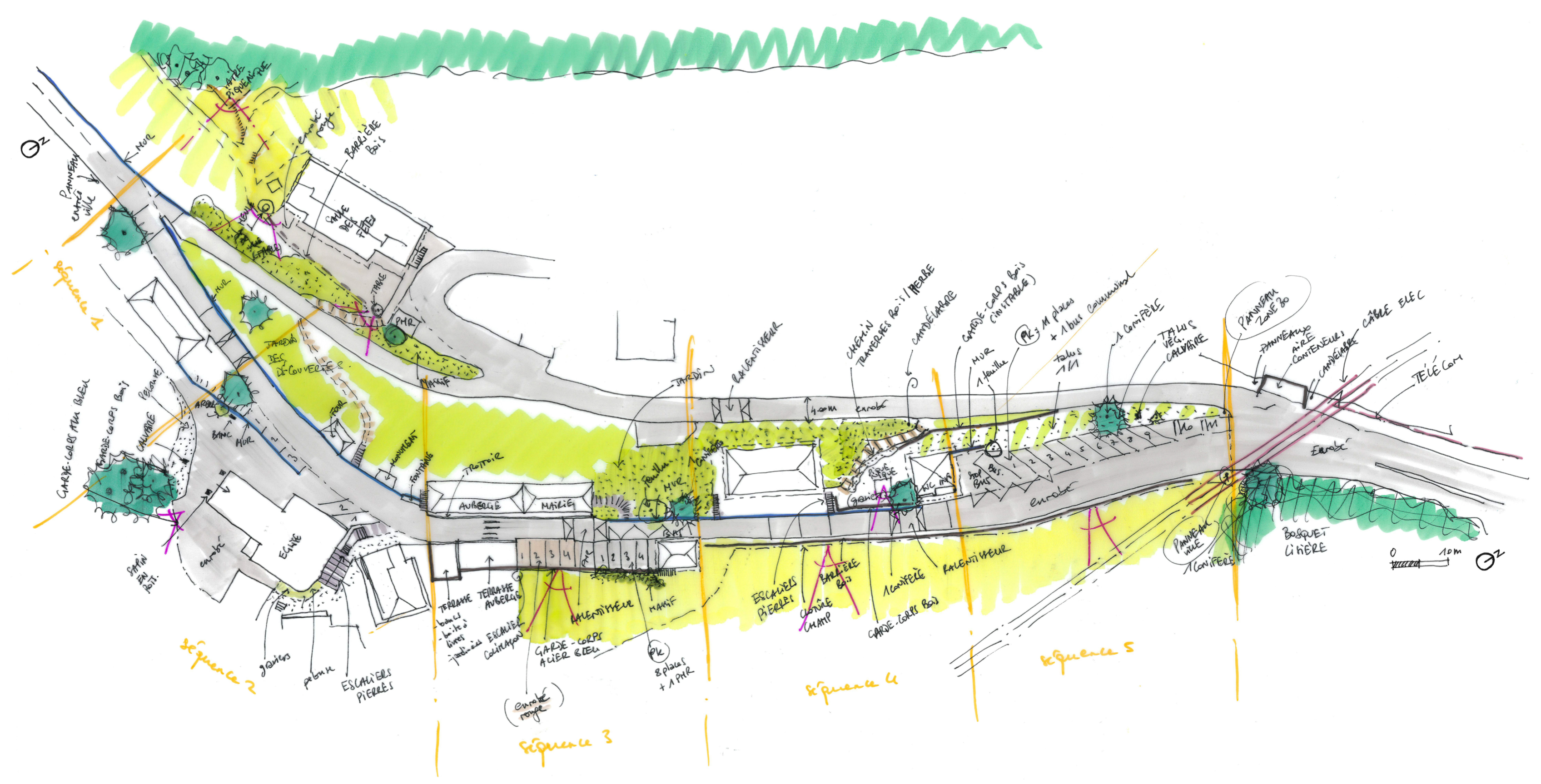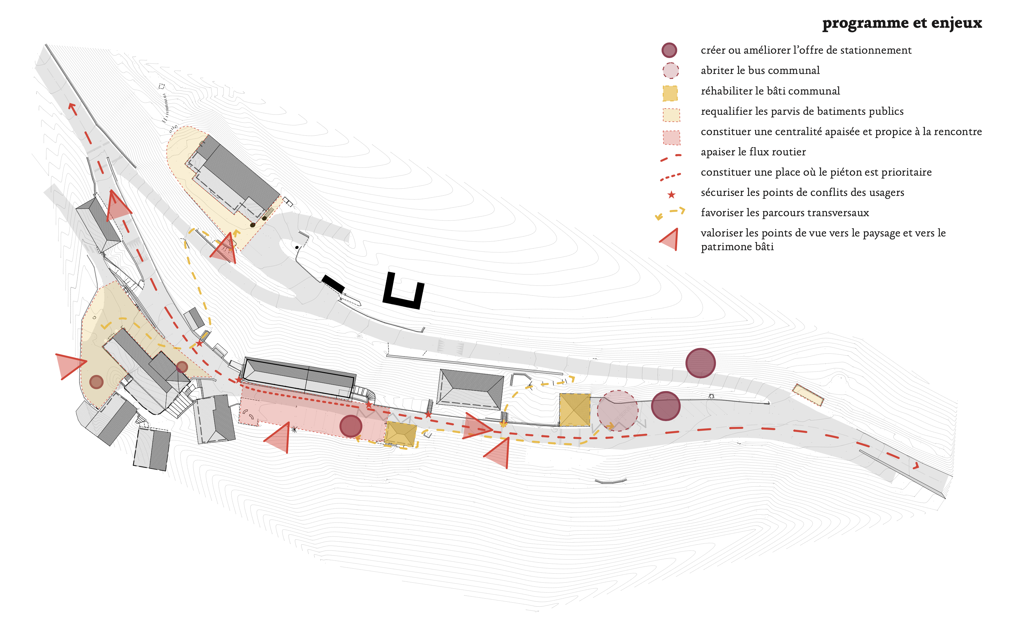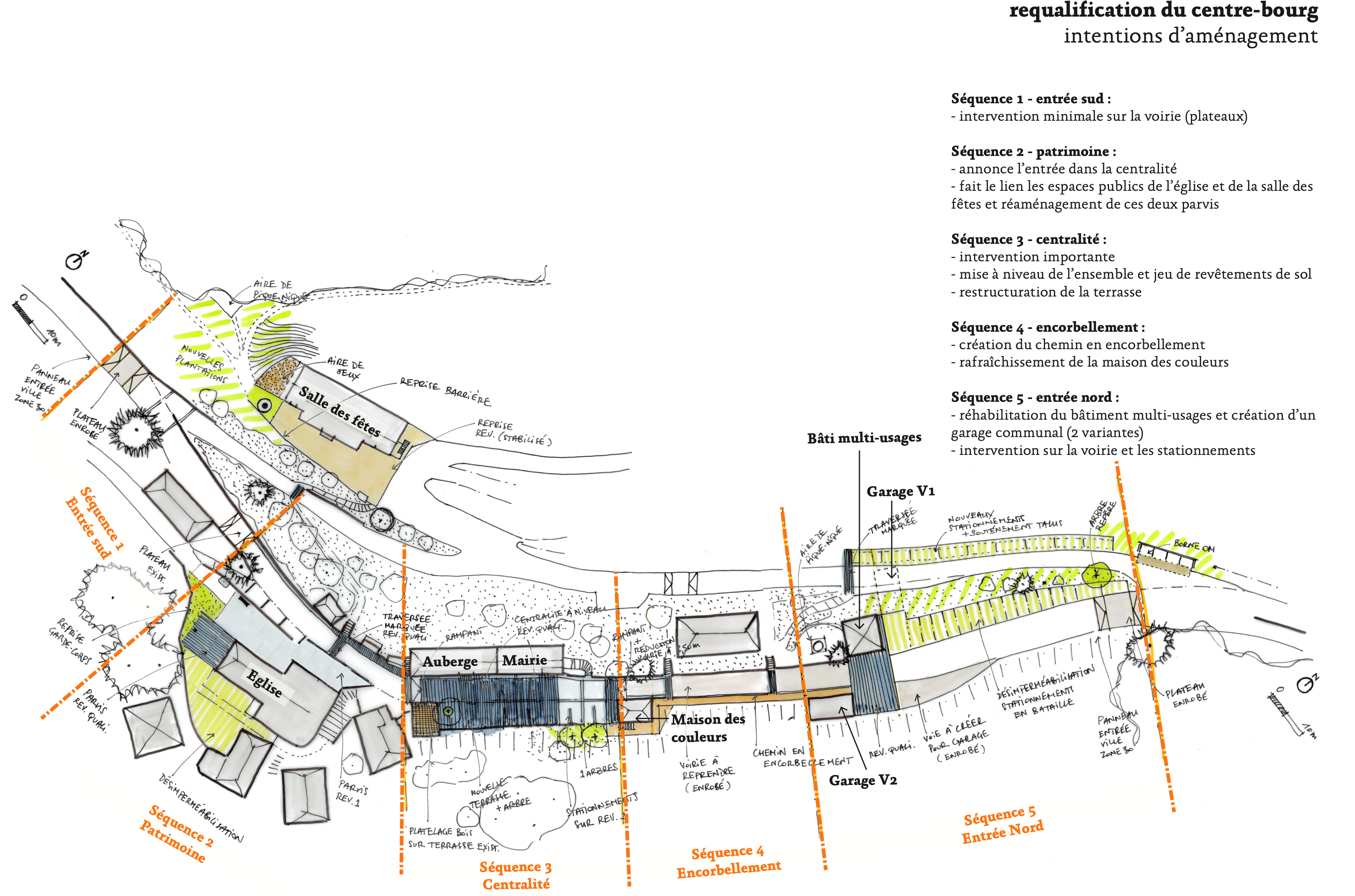 Pour traiter finement chaque sujet, une approche de projet par acupuncture est menée tout en reliant entre elles chaque intervention dans une perspective générale et cohérente sur tout le chef-lieu. Ainsi les aménagements sont séquencés tout au long de la traversée : séquence 1 entrée sud, séquence 2 patrimoine, séquence 3 centralité, séquence 4 encorbellement, séquence 5 entrée nord. Ils concernent la création de plateaux, l’aménagement d’une place centrale, la mise en place d’un cheminement en encorbellement, la création de nouveaux stationnements et la requalification des parvis de l’église et de la salle des fêtes.