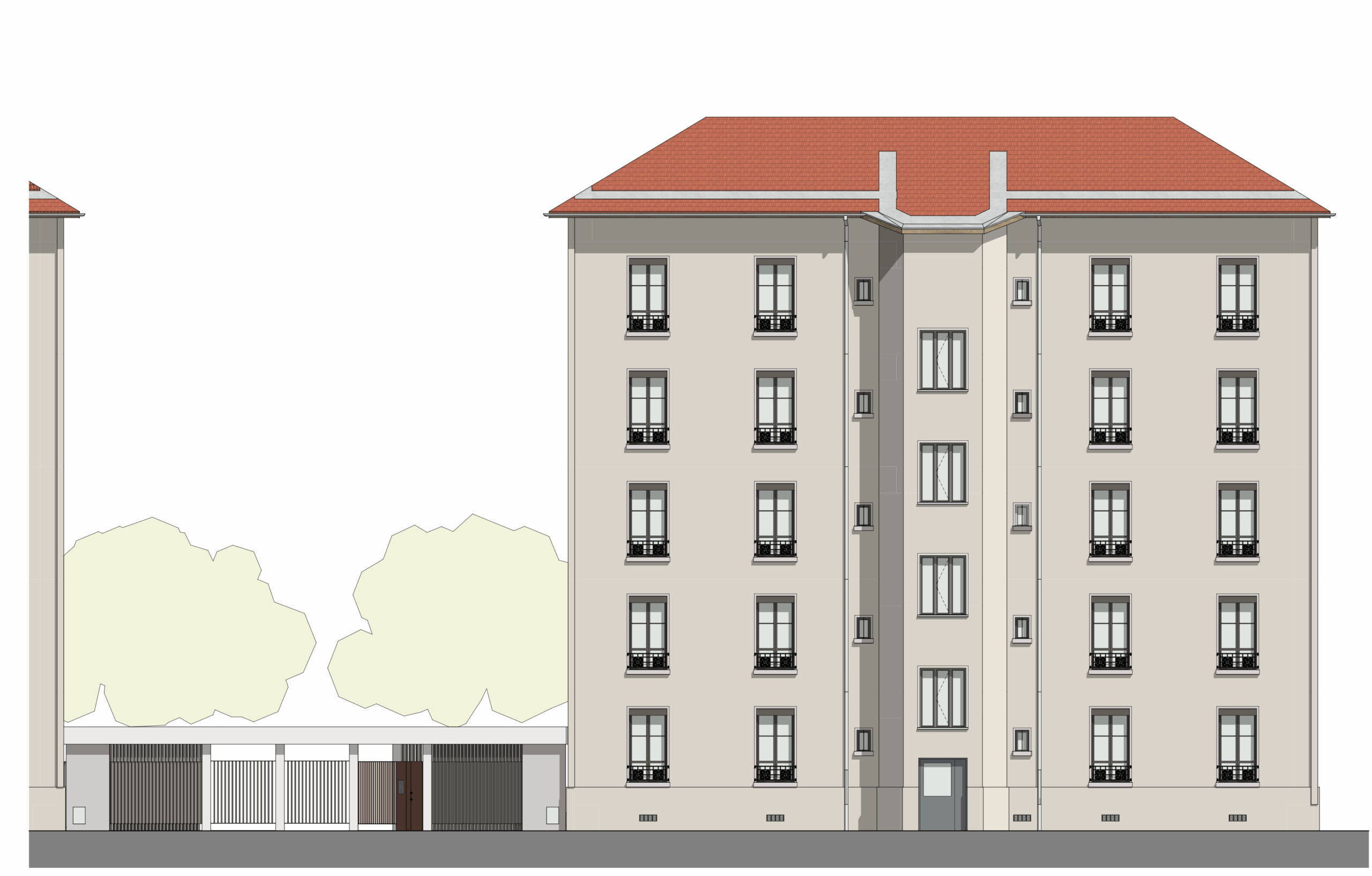 Le projet inclut l’installation d’une pension de famille avec préservation du patrimoine arboré existant et 860 m² désimpermeabilisés sur l’ensemble du site. Des plantations d’arbres d’ombrage enrichissent les espaces intimes et fonctionnels pour les usagers, tandis que des matériaux pérennes et locaux sont privilégiés, avec déclinaison des tuiles centenaires déposées sous différentes formes de réemploi.