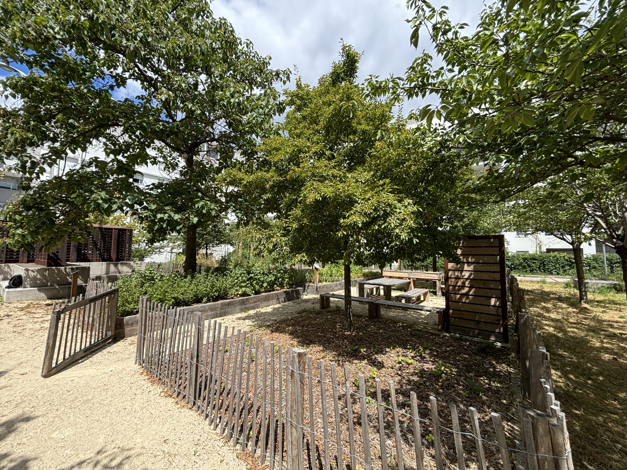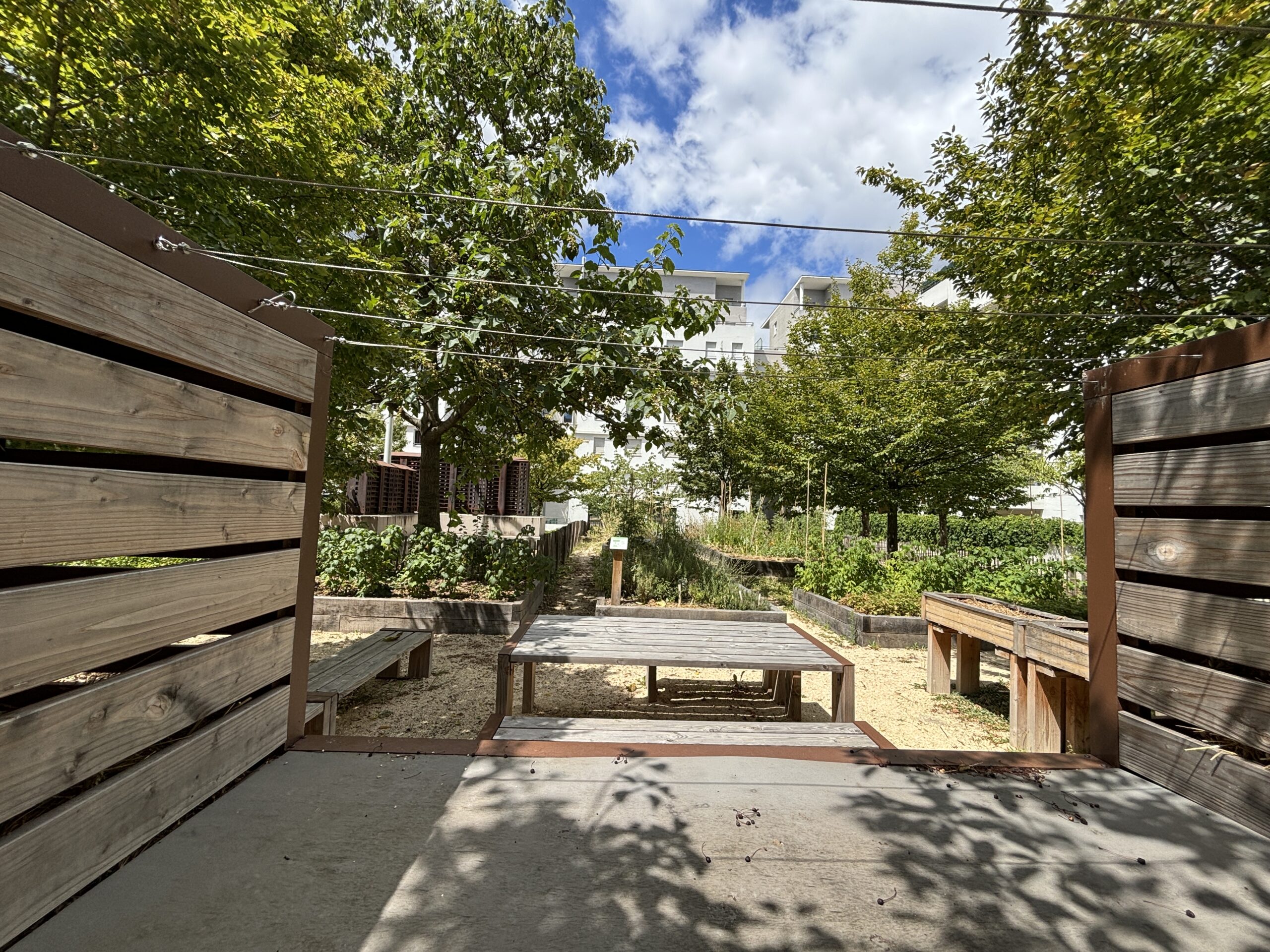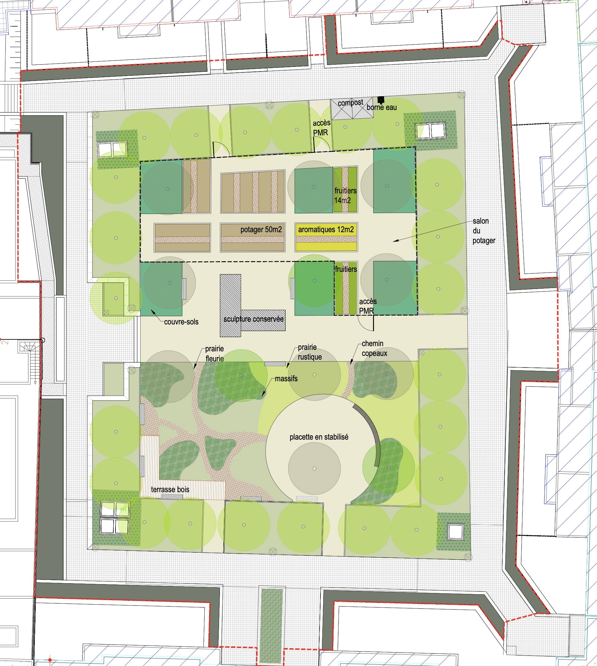 De part les caractéristiques techniques, l’ensoleillement et les usagers du site, le projet de micro-ferme laisse finalement place à un projet de potager partagé et de jardin collectif à destination des résidents. Le cœur de cour réaménagé invite à la déambulation et permet aux habitants de s’approprier le lieu à travers différents espaces : une jardin d’ornement partagé, une placette conviviale, un potager partagé. La sculpture existante est conservée et intégrée au dessin général.