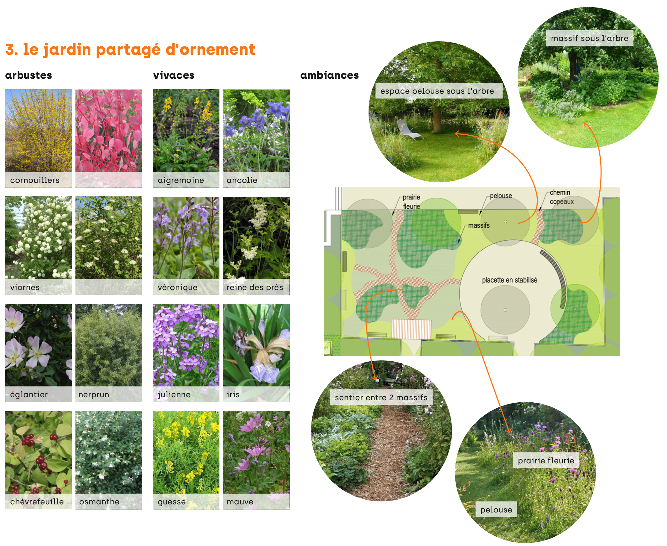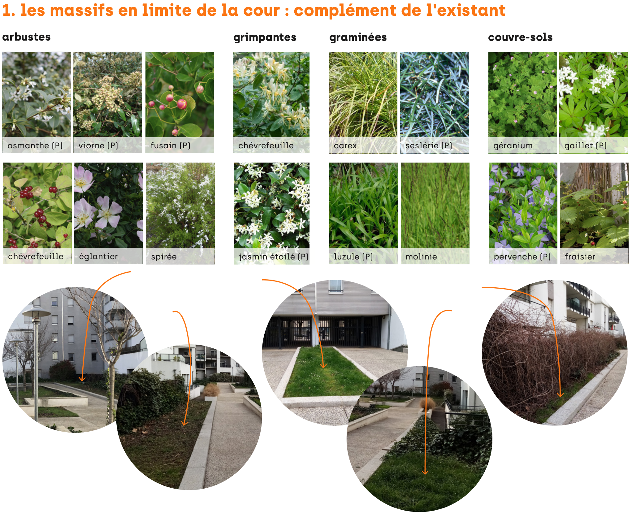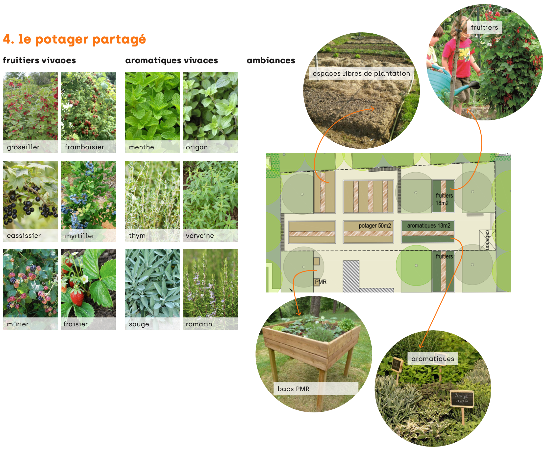De part les caractéristiques techniques, l’ensoleillement et les usagers du site, le projet de micro-ferme laisse finalement place à un projet de potager partagé et de jardin collectif à destination des résidents. Le cœur de cour réaménagé invite à la déambulation et permet aux habitants de s’approprier le lieu à travers différents espaces : une jardin d’ornement partagé, une placette conviviale, un potager partagé. La sculpture existante est conservée et intégrée au dessin général.