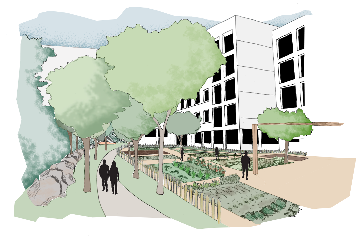 L’espace devient un lieu de partage et de convivialité : les enfants jouent, les habitants cultivent leur jardin, les promeneurs déambulent dans le parc. Tous profitent ainsi du bien-être procuré par une activité commune dans la nature. Les aménagements proposent une place prédominante au végétal et à l’eau (arbres d’ombrage, palette comestible, récupération des eaux pluviales pour arroser le potager, sols perméables, etc.).