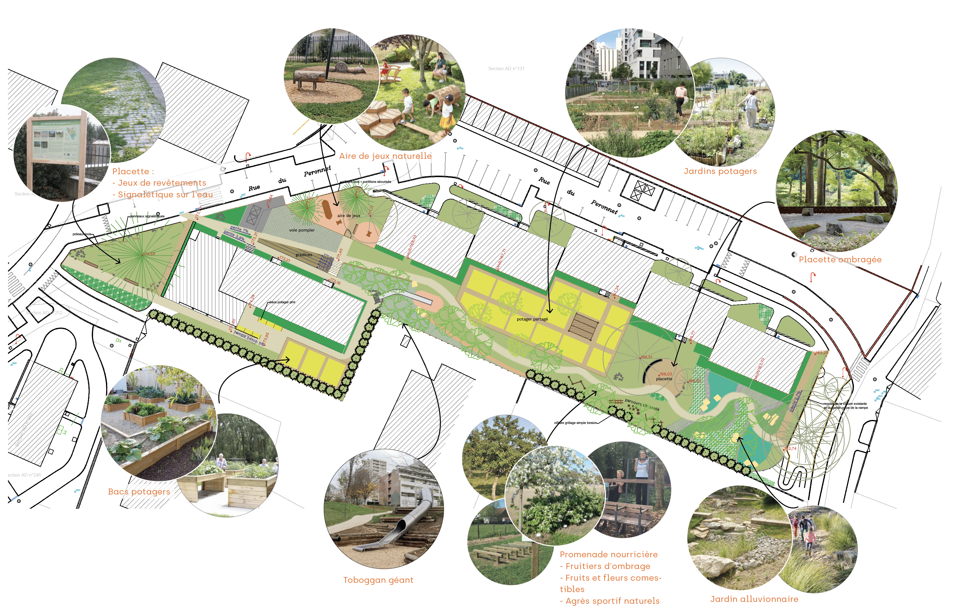 Plusieurs concertations publiques nous ont permises de coconcevoir avec les habitants un projet simple mais ambitieux. Faire revivre un espace stérile et donc peu exploité par ses habitants avec la mise en place d’un aménagement frugal mêlant cultures et générations, sous la fraicheur d’un paysage nourricier.