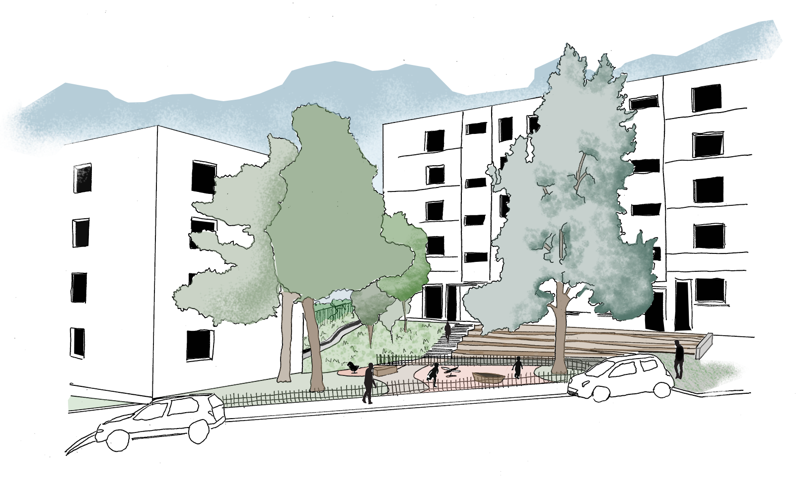 L’espace devient un lieu de partage et de convivialité : les enfants jouent, les habitants cultivent leur jardin, les promeneurs déambulent dans le parc. Tous profitent ainsi du bien-être procuré par une activité commune dans la nature. Les aménagements proposent une place prédominante au végétal et à l’eau (arbres d’ombrage, palette comestible, récupération des eaux pluviales pour arroser le potager, sols perméables, etc.).