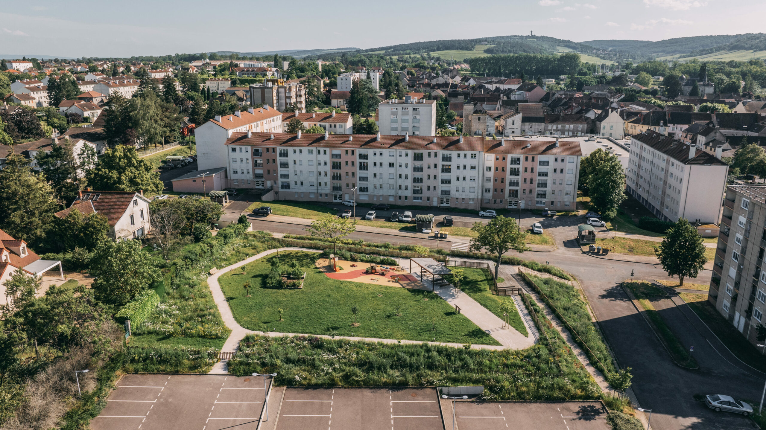 Afin de valoriser et dynamiser le quartier et l’entrée du centre-bourg, la mairie de Chagny a souhaité réaménager deux de ses squares, situés en vis à vis de part et d’autre de la route départementale (avenue de Gaulle) : le square de l’ Arlequin en limite du centre historique et le square Bellevue, ancien verger en faubourg récent. L’avenue de Gaulle est également requalifiée, apaisée et végétalisée.