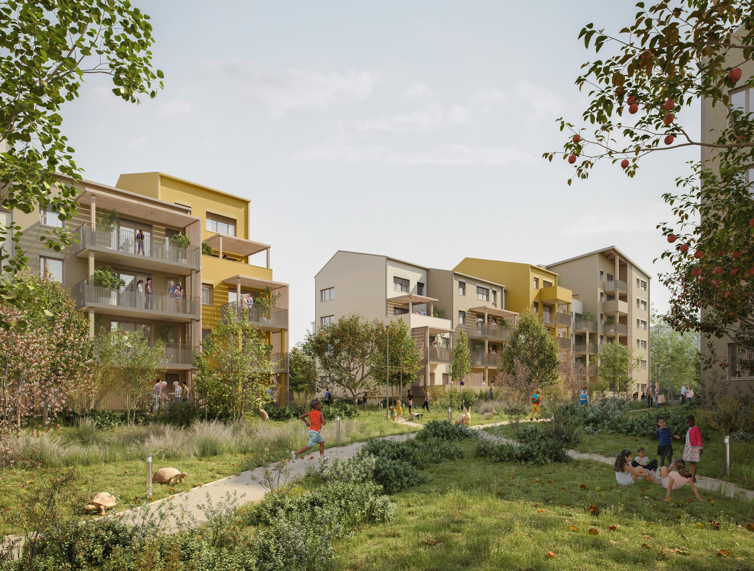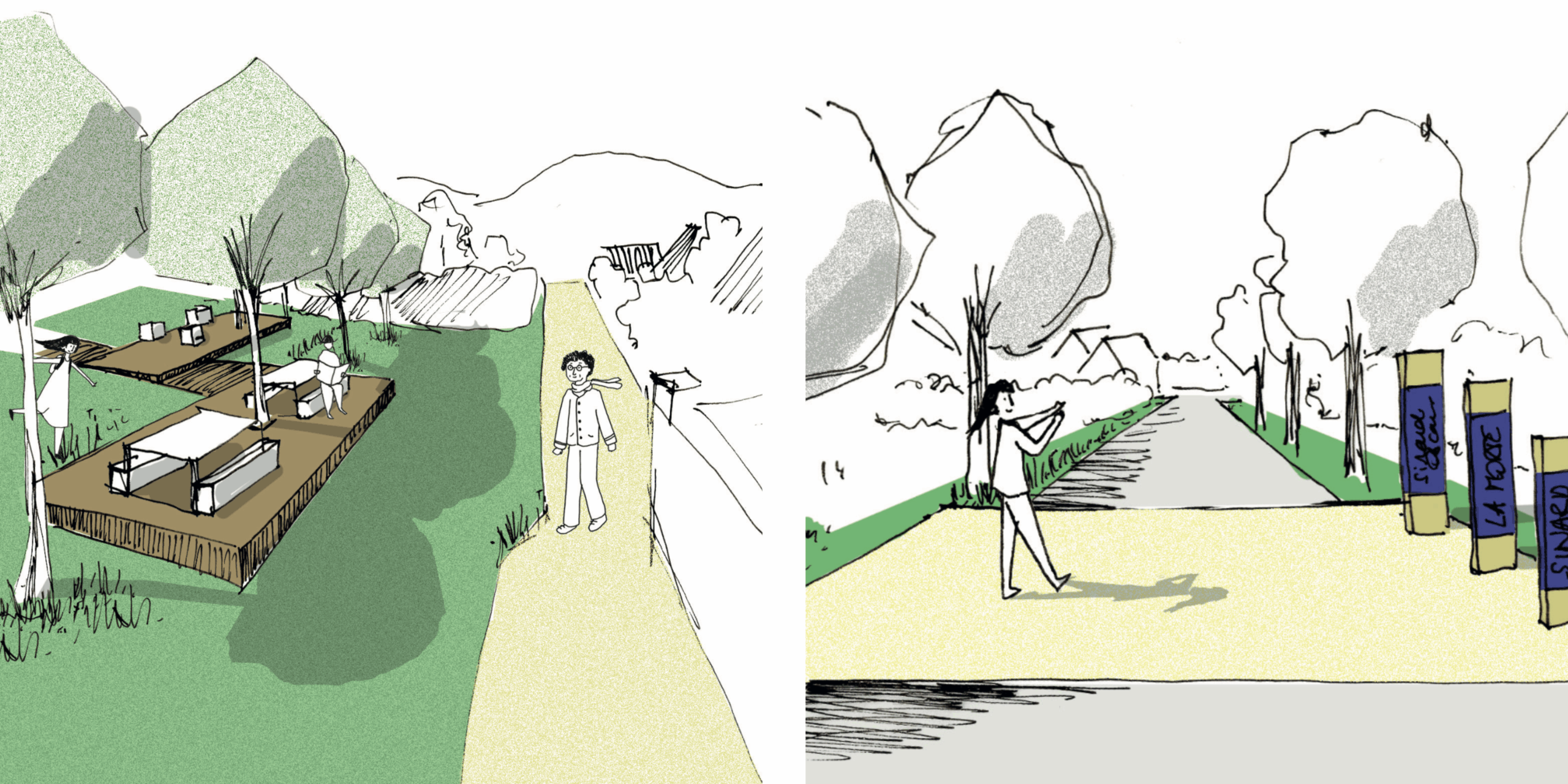 Le projet de terrain multisport à Sinard s’inscrit dans la continuité d’un diagnostic paysager complet de la commune afin de préserver son identité rurale tout en accompagnant son développement. La renaturation et la désimperméabilisation des sols permettent de créer un bois, un verger et un enherbement important, offrant un cadre de loisirs ancré dans le paysage agricole. Les équipes imaginent des aires de jeux pour enfants et des espaces collectifs où les habitants peuvent se rencontrer et se détendre. Une butte avec la terre réemployée est modelée, celle-ci offre une percée visuelle sur le paysage et accueille des hamacs pour profiter de la vue. Par ailleurs, la terre végétale et le bois local sont réutilisés sur le site, renforçant ainsi la durabilité et l’identité du projet.